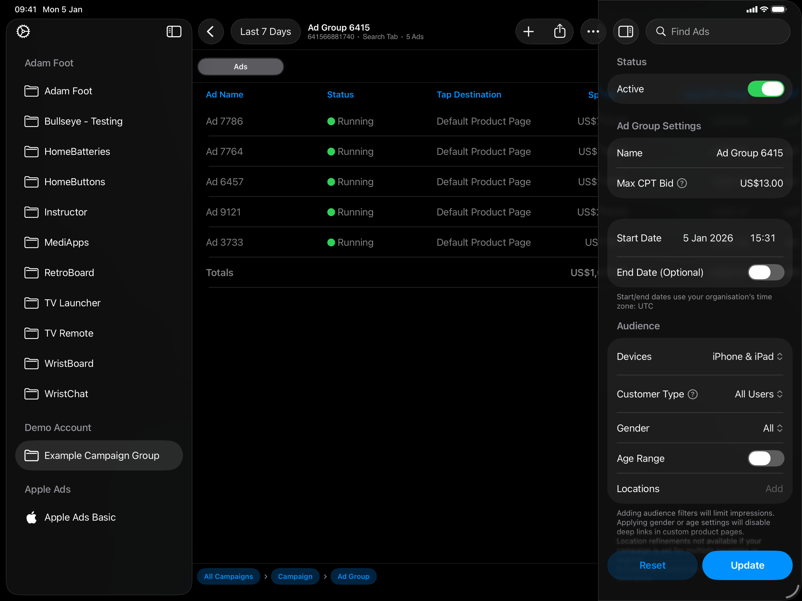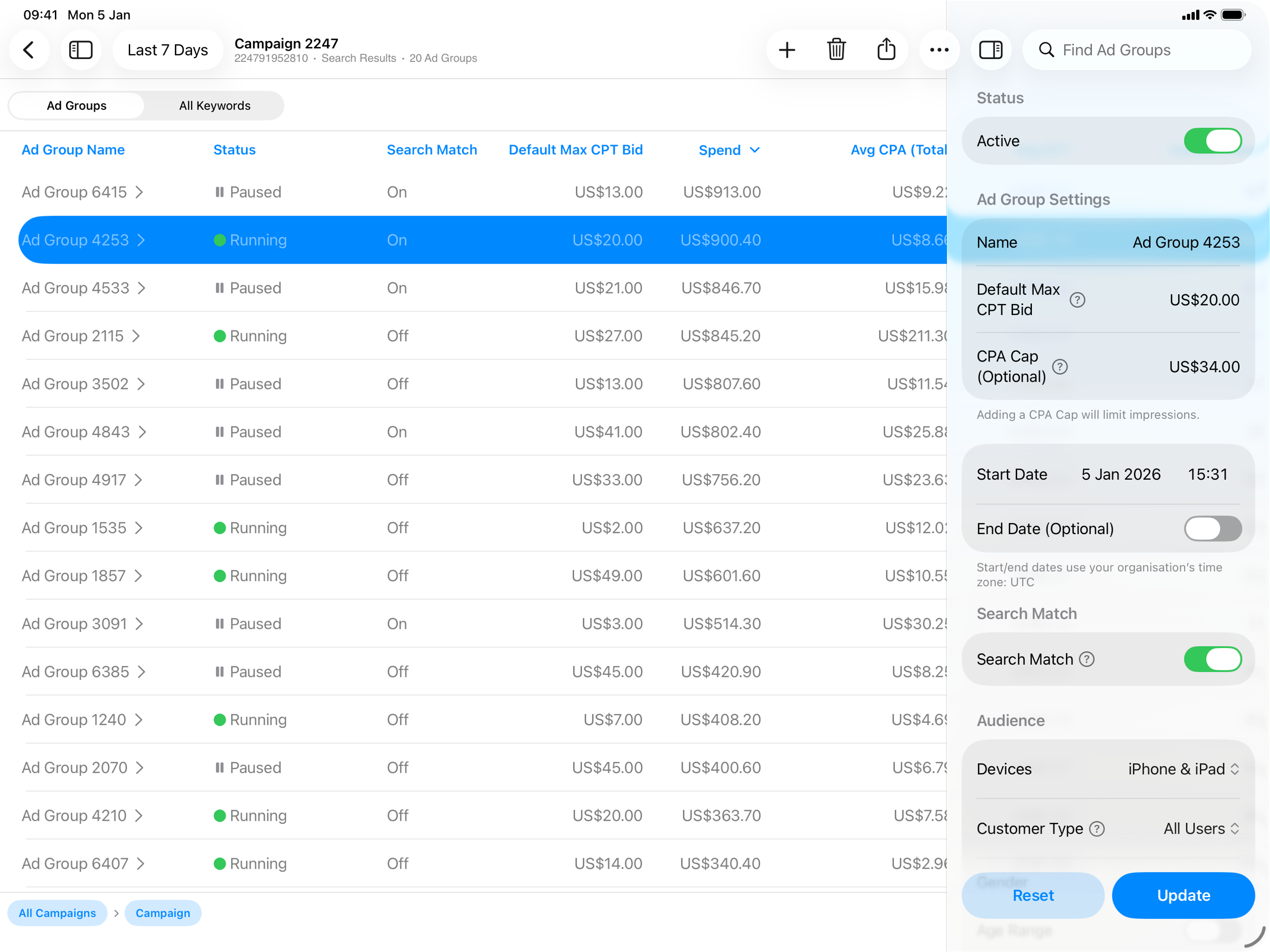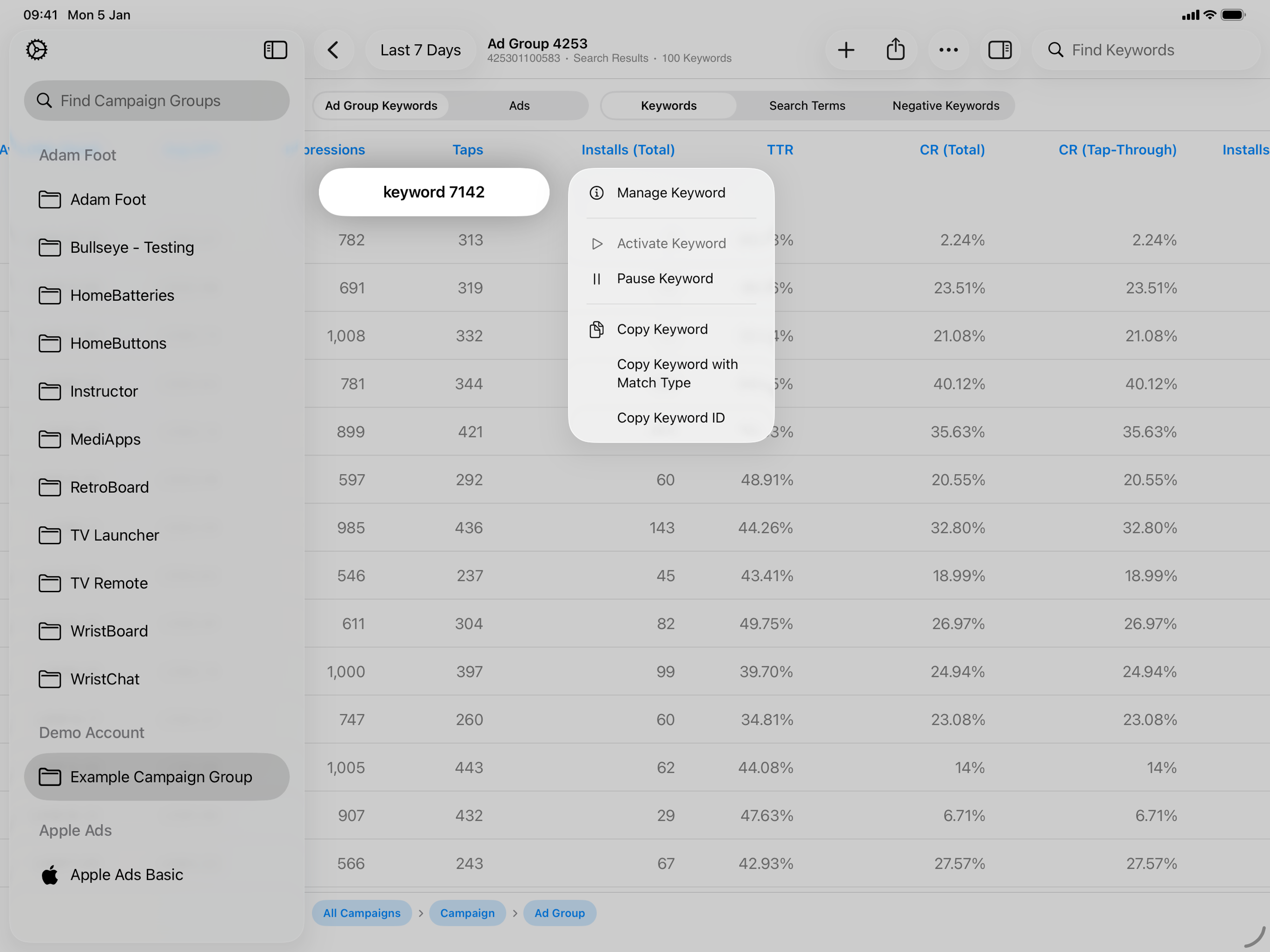 Easily manage your Apple Ads campaigns from one place with the ability to make changes or drill down into ad groups and keywords.