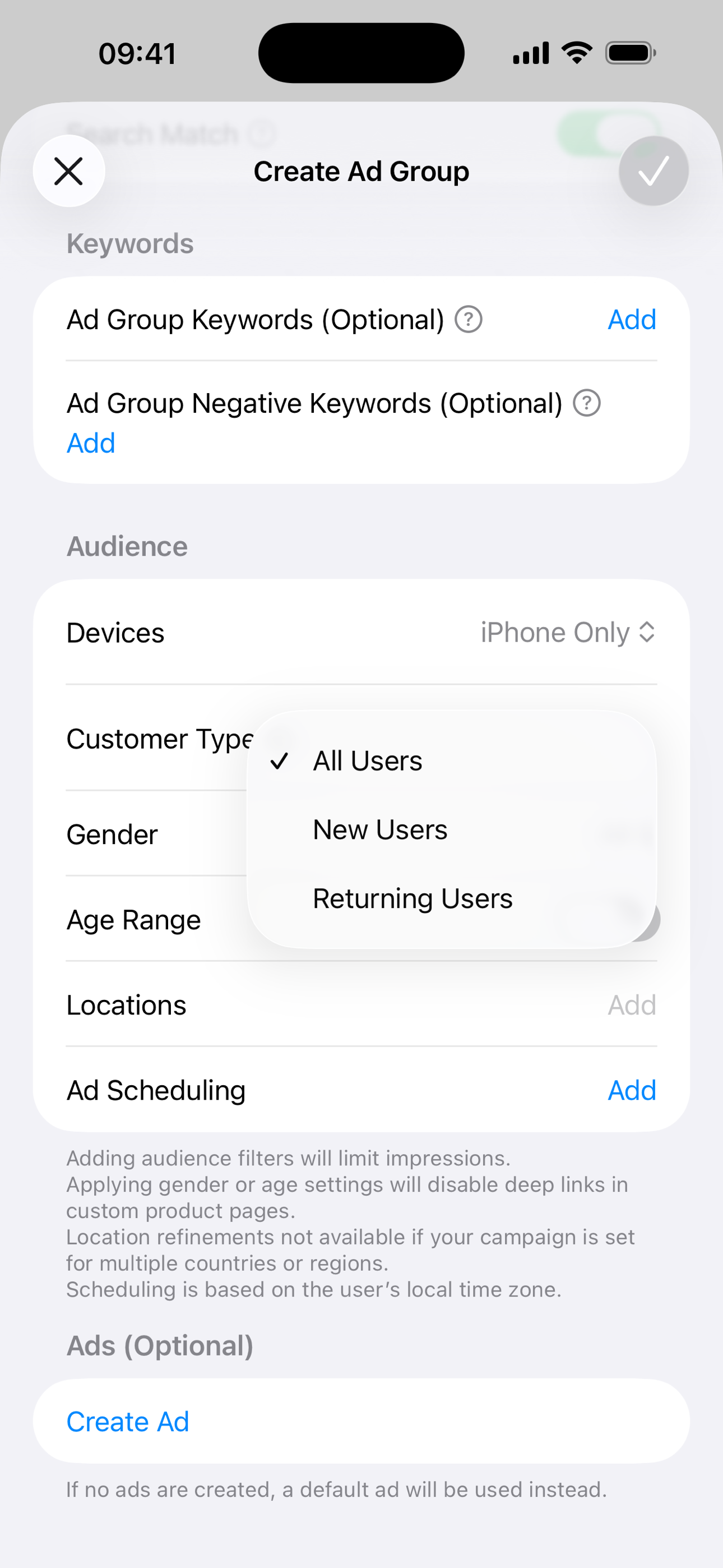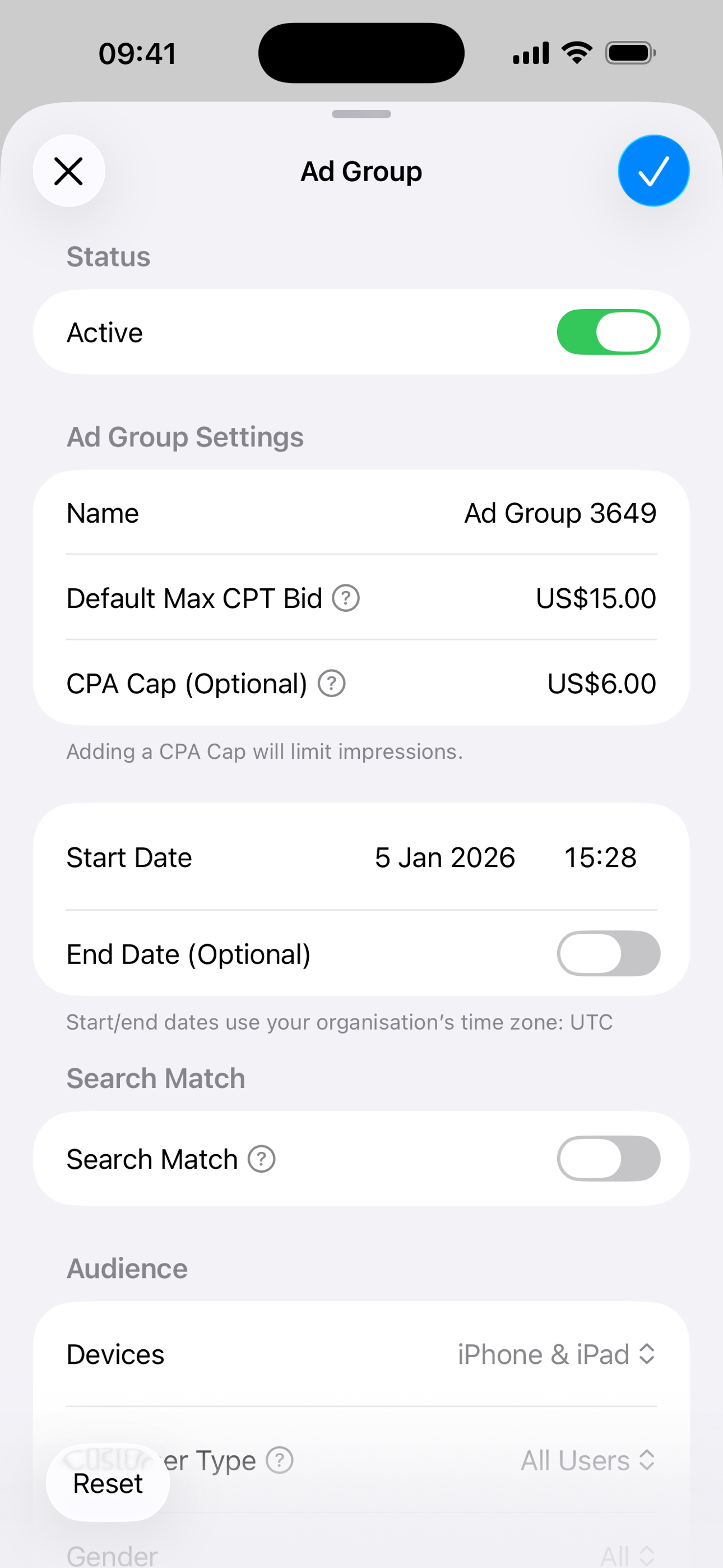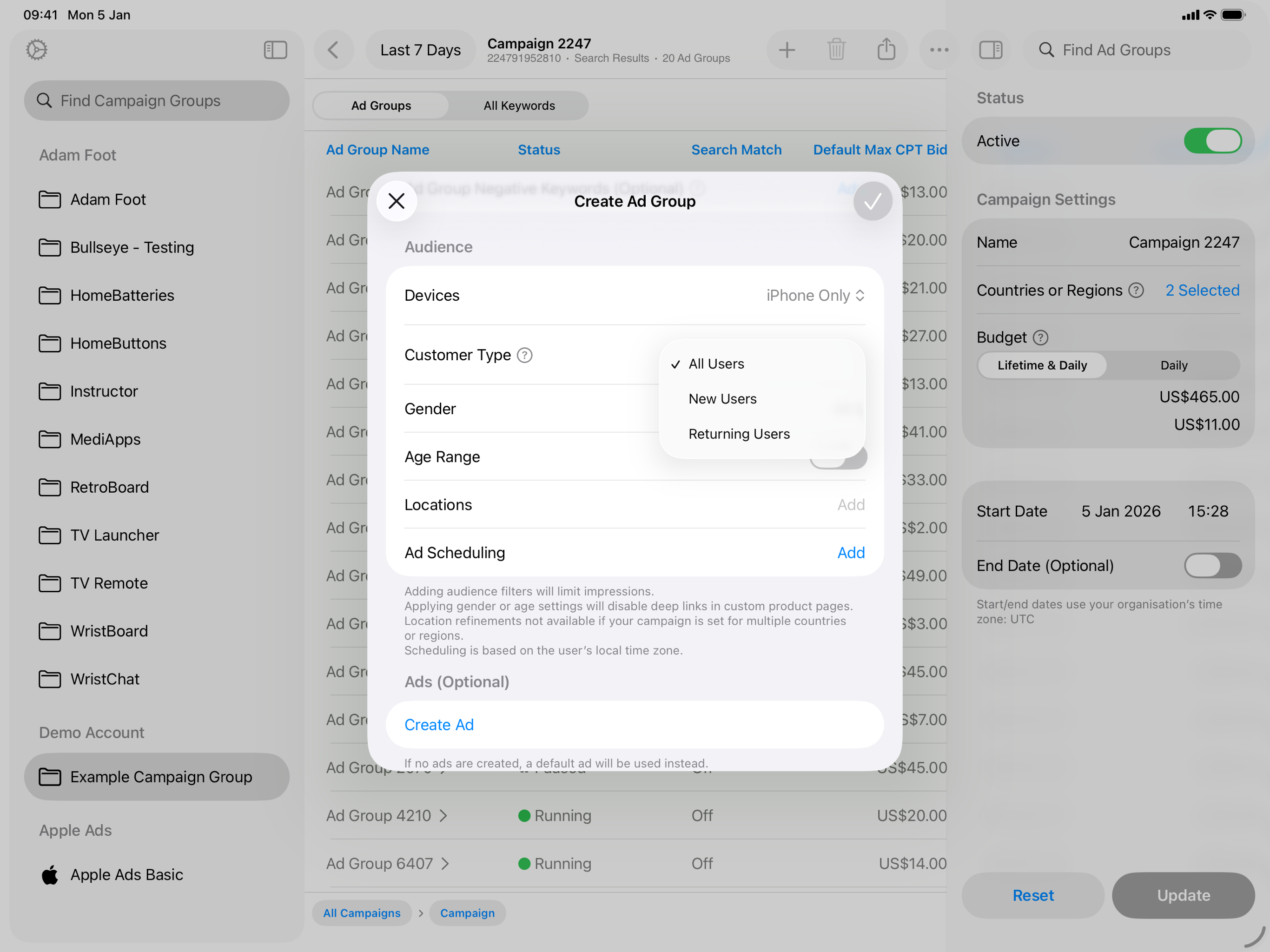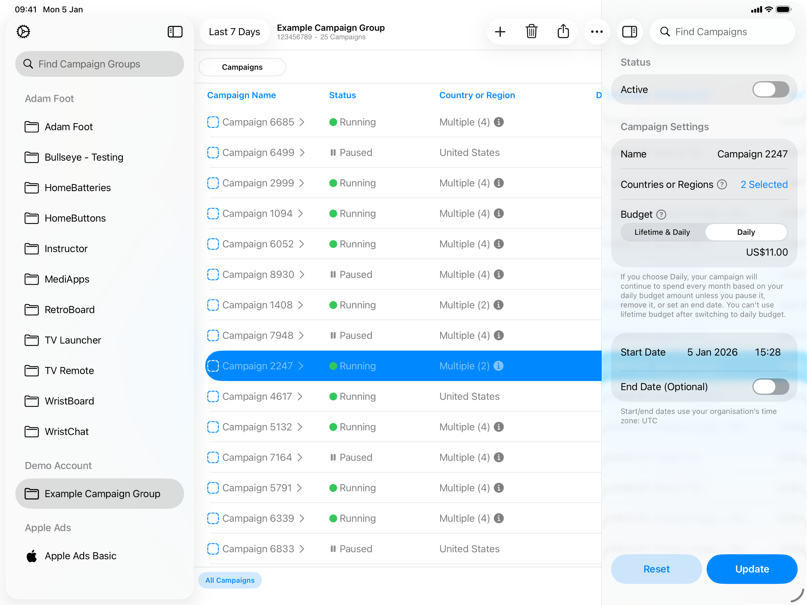 Easily manage your Apple Ads campaigns from one place with the ability to make changes or drill down into ad groups and keywords.