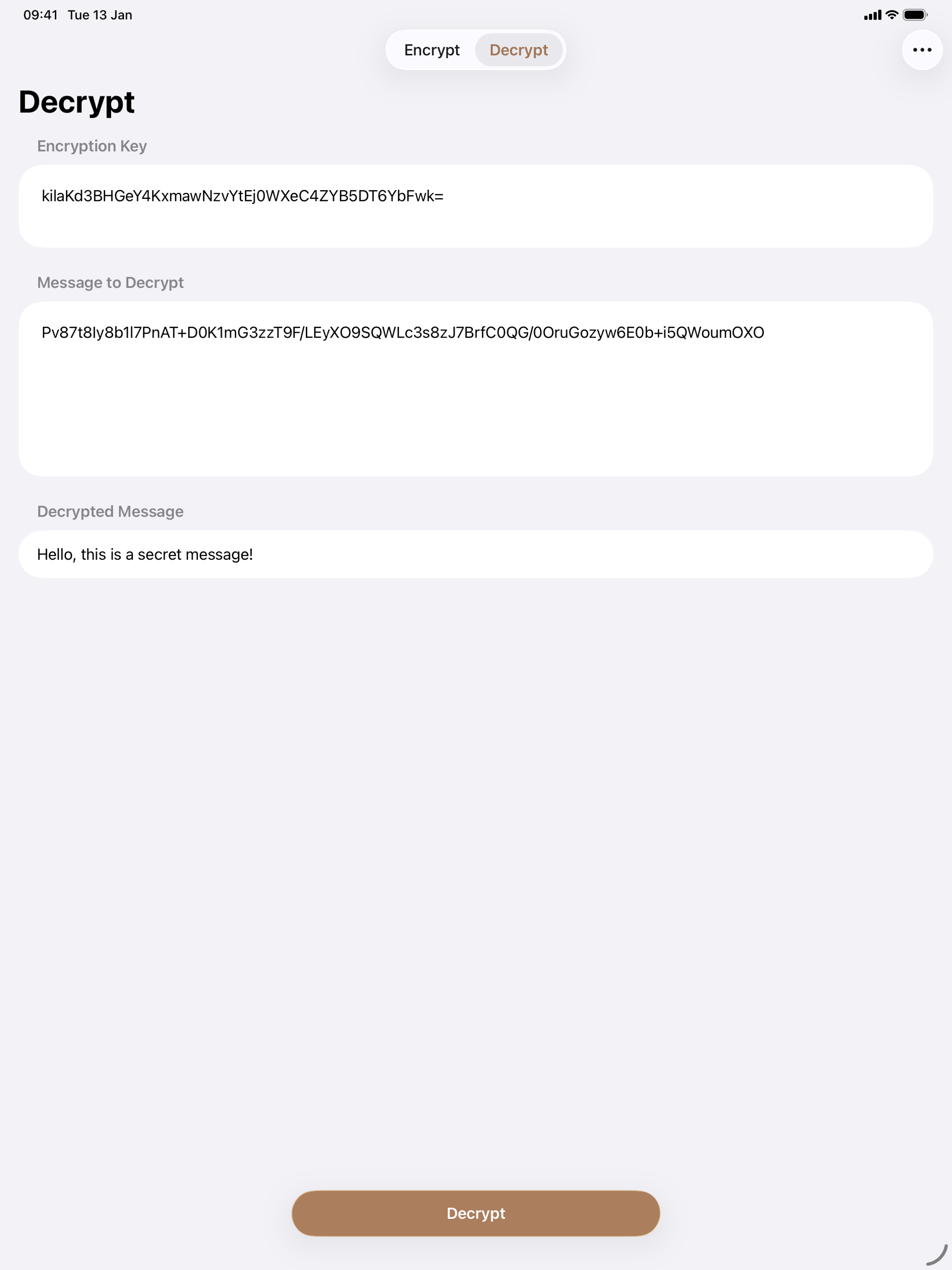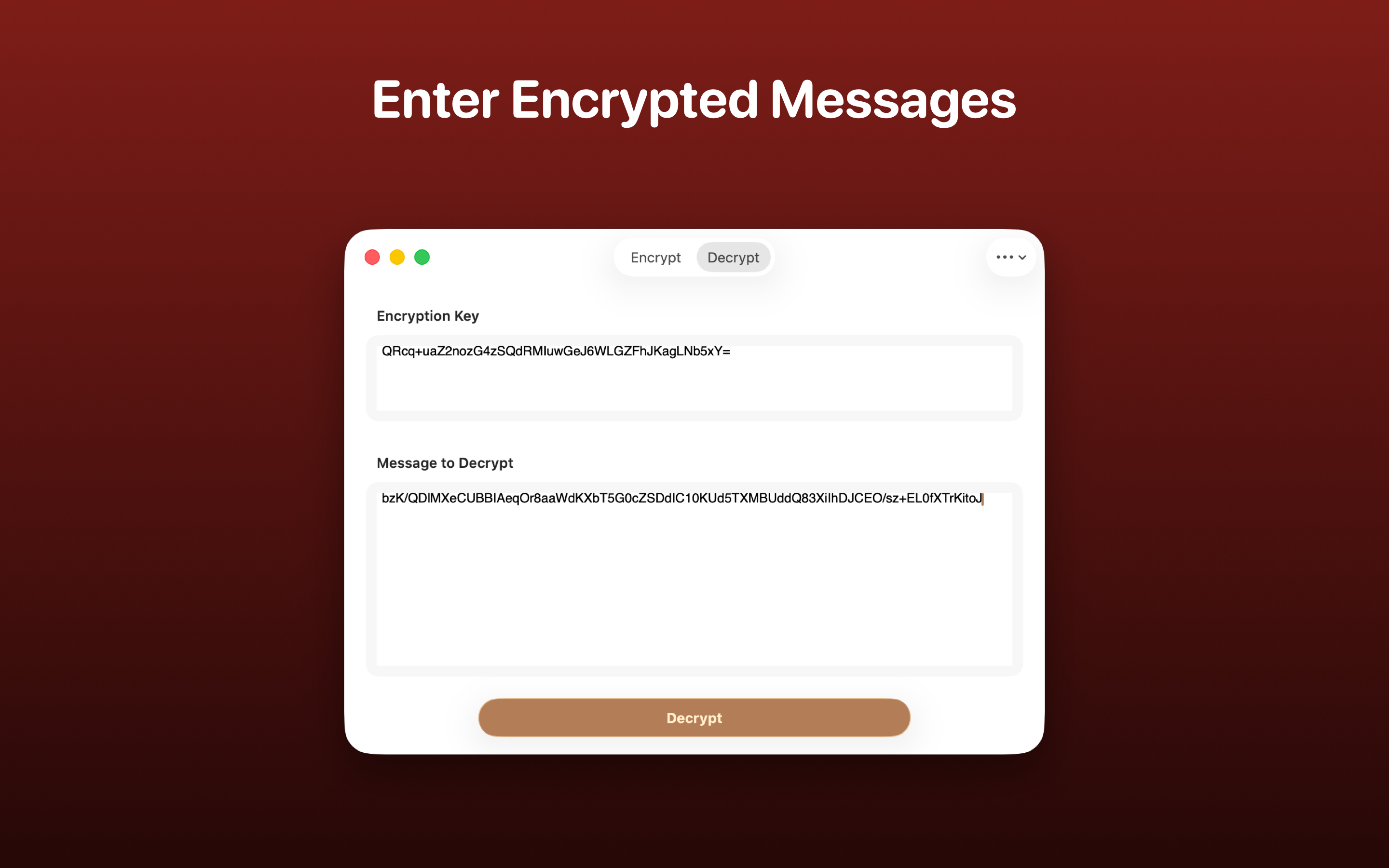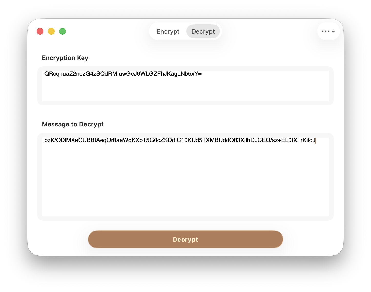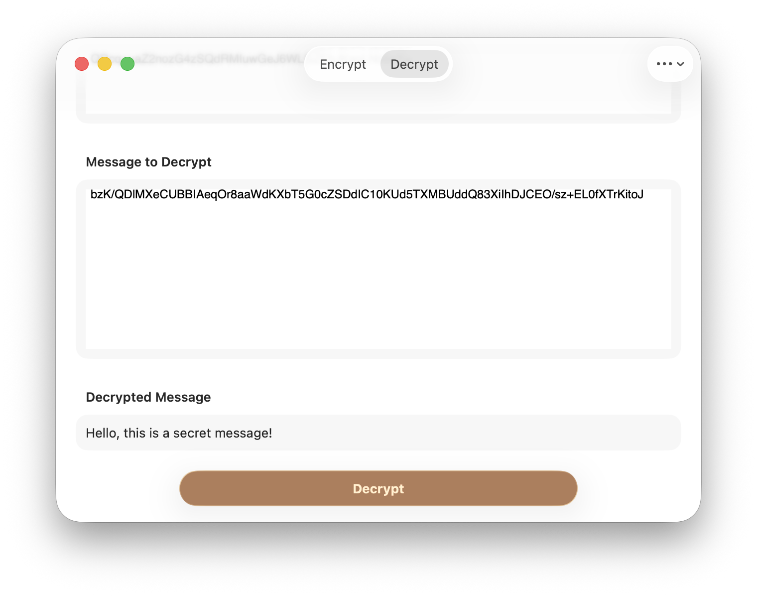 If you receive an encrypted message from another Cipher user, you can use the Decrypt function to view it. Enter the sent encryption key and the encrypted message, then select Decrypt. The message will then be decrypted and you’ll be able to view the original message!