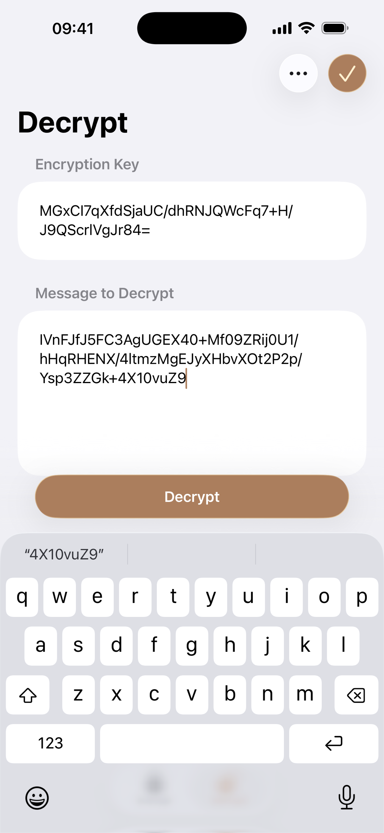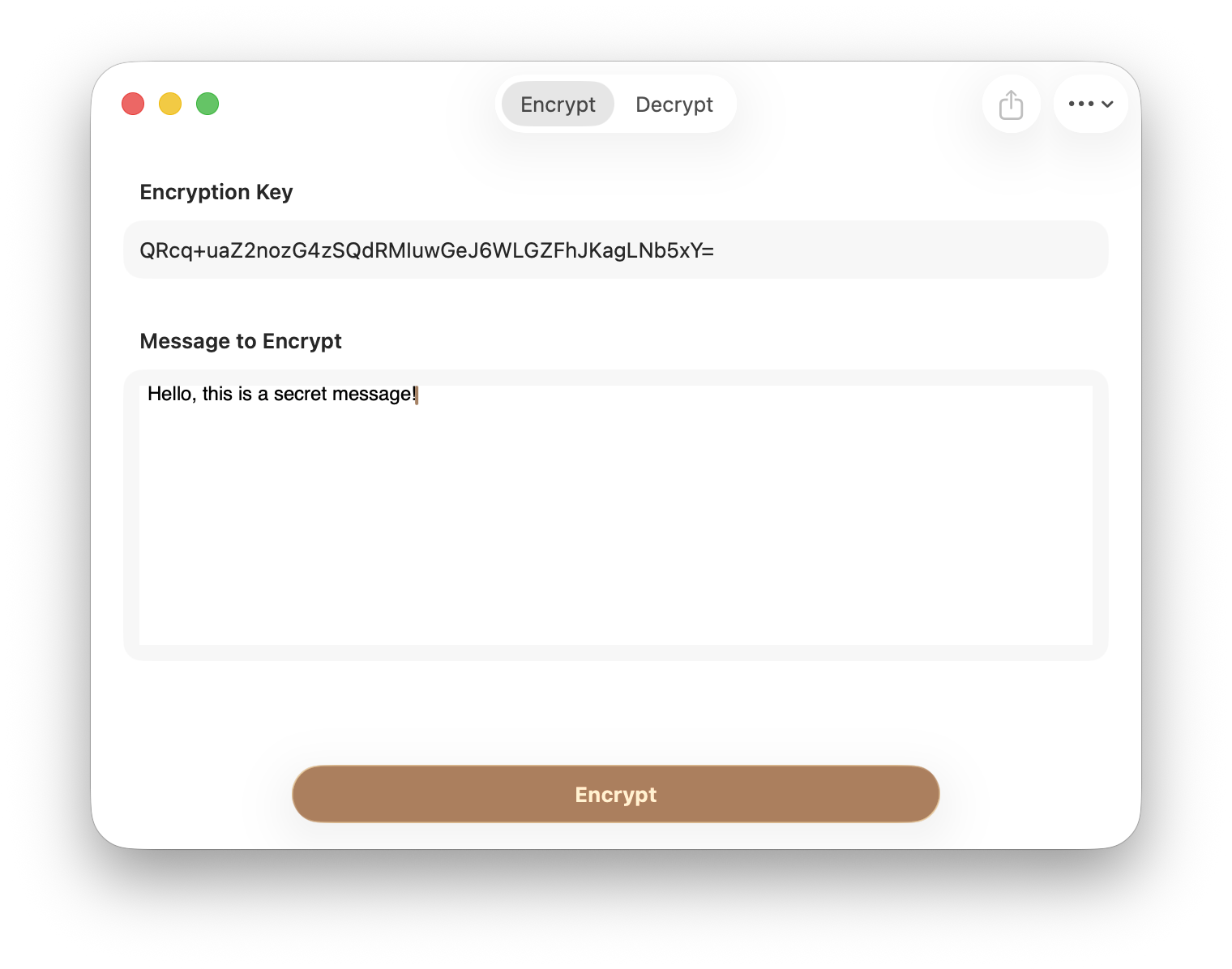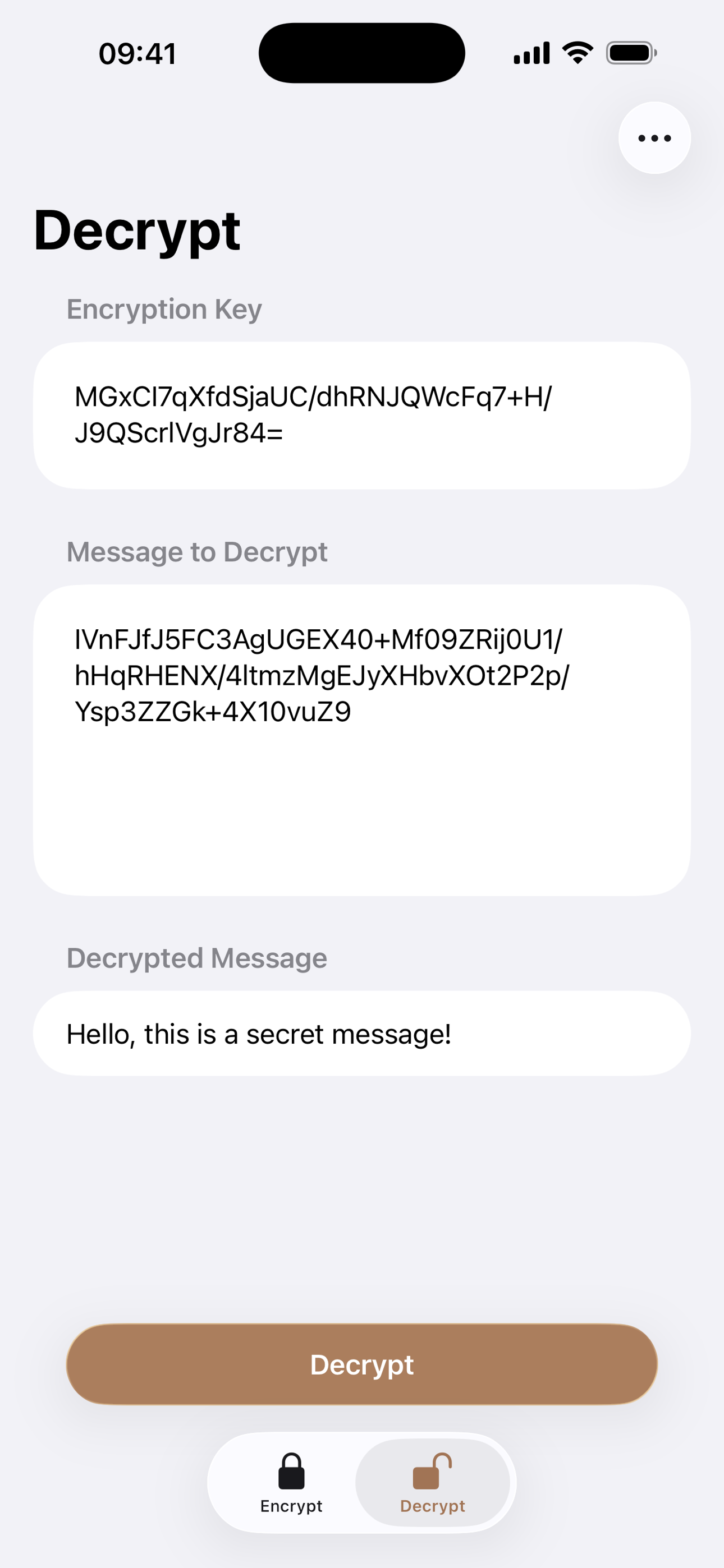 If you receive an encrypted message from another Cipher user, you can use the Decrypt function to view it. Enter the sent encryption key and the encrypted message, then select Decrypt. The message will then be decrypted and you’ll be able to view the original message!