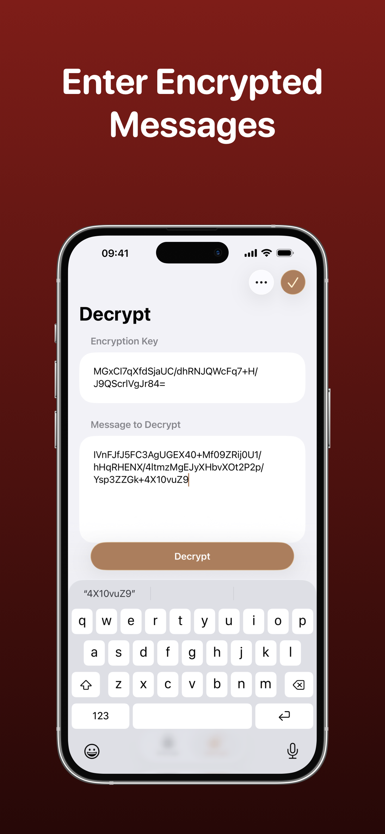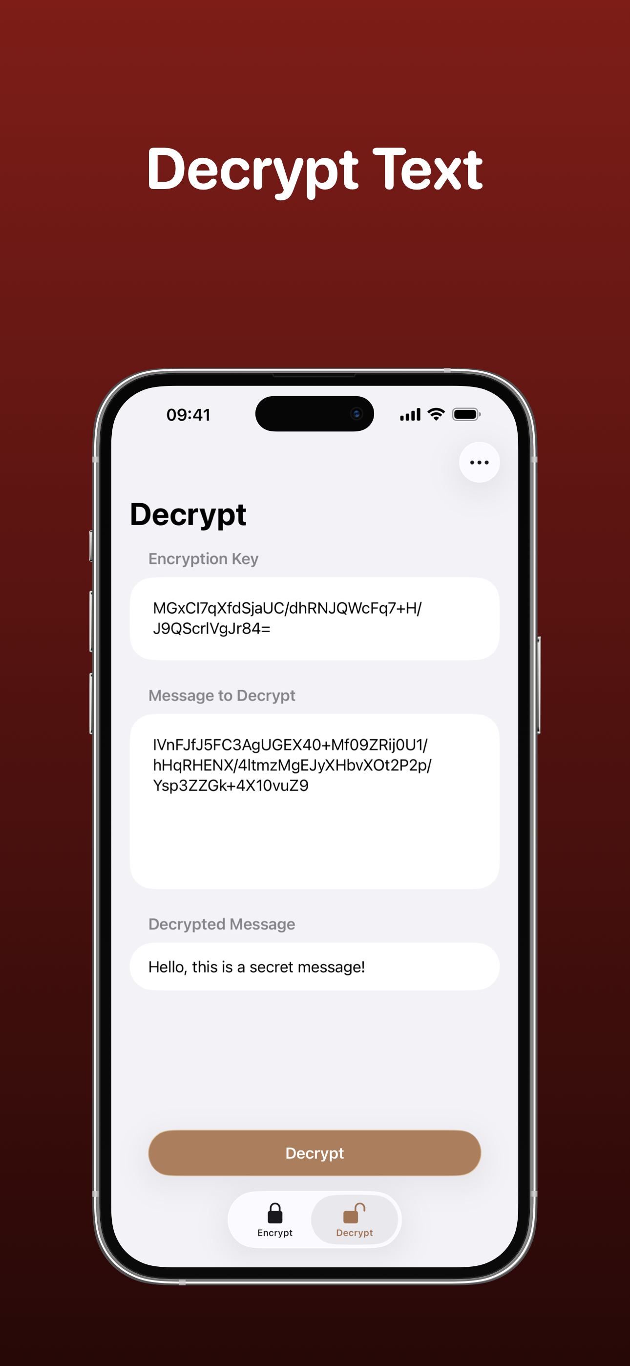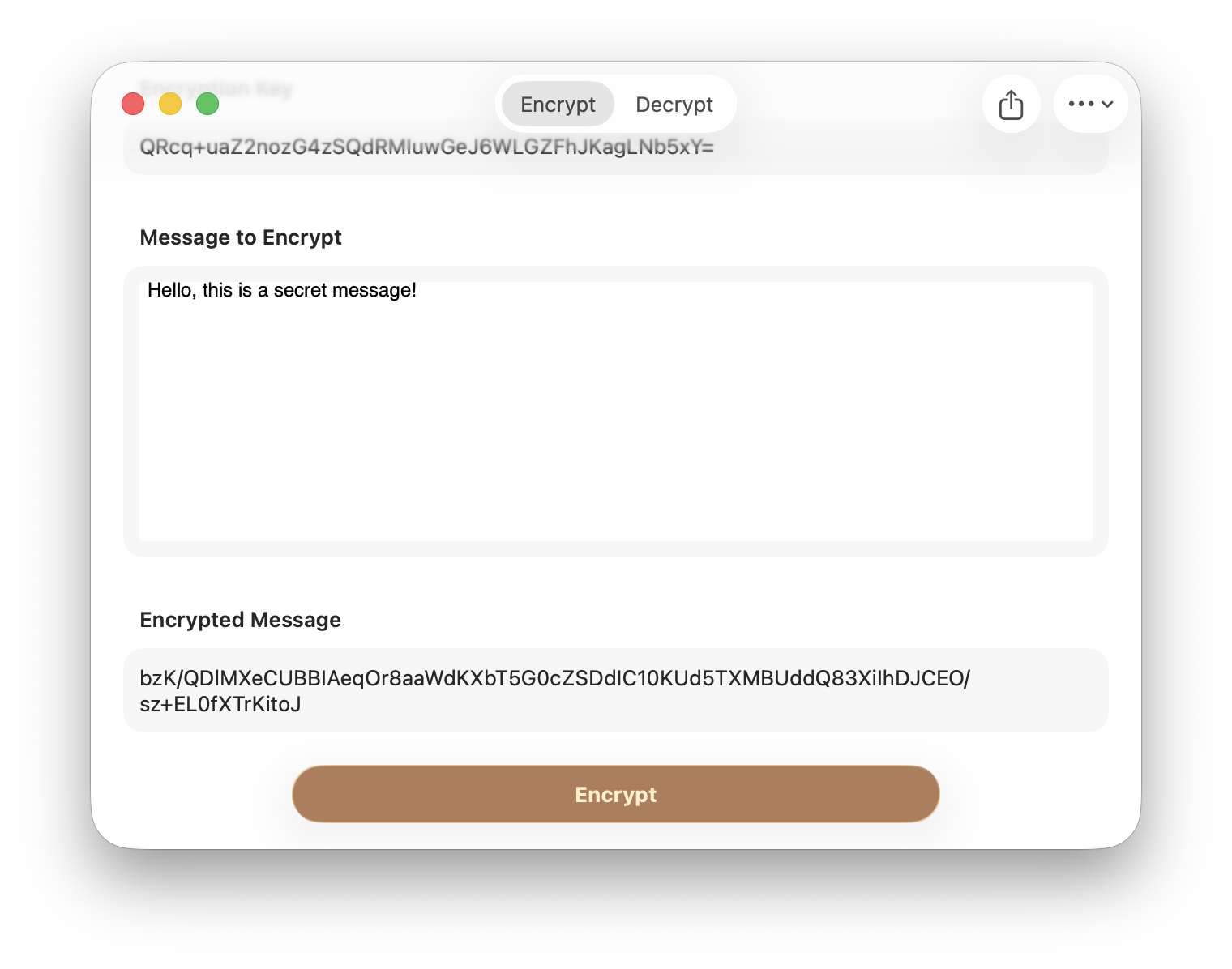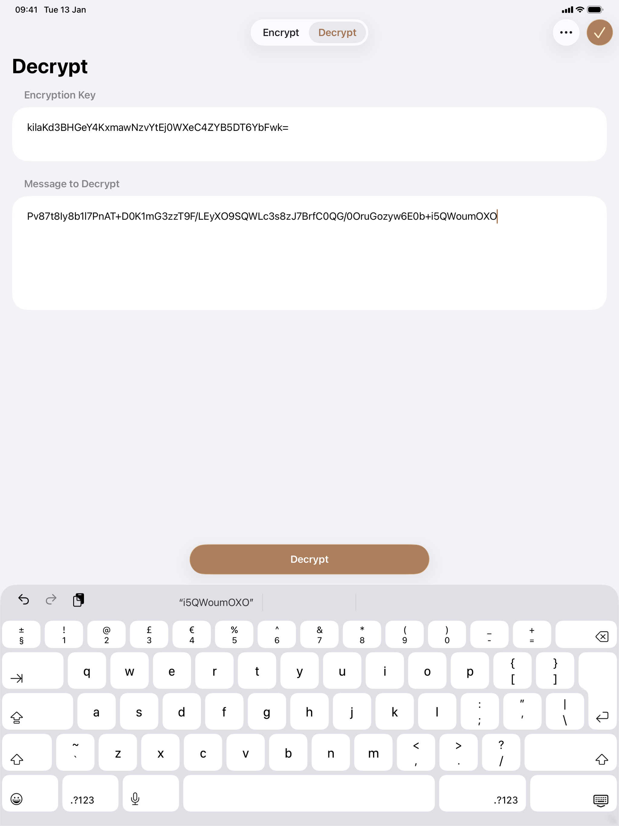 If you receive an encrypted message from another Cipher user, you can use the Decrypt function to view it. Enter the sent encryption key and the encrypted message, then select Decrypt. The message will then be decrypted and you’ll be able to view the original message!